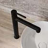 Стильный высокий смеситель для настольного умывальника удачно сочетает актуальный современный дизайн и популярный черный цвет. Удлиненная ручка добавляет смесителю изящества и комфорт в управлении. Расстояние между ручкой и изливом увеличено для большего удобства.
