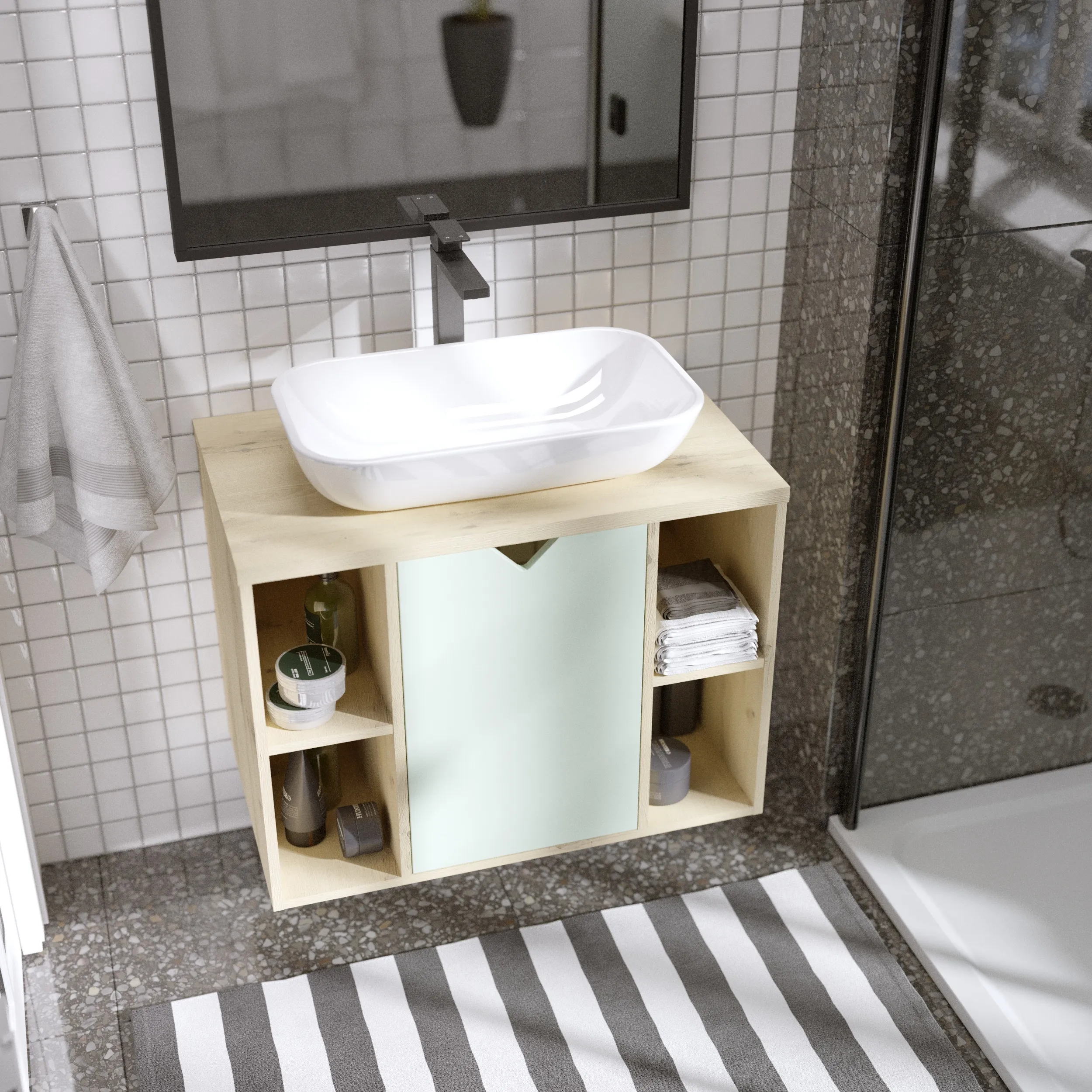 • В тумбе удобно организовать хранение. В открытых полках можно разместить органайзеры, предметы ежедневного пользования и декоративные элементы. А в закрытой – бытовую химию или средства личной гигиены.