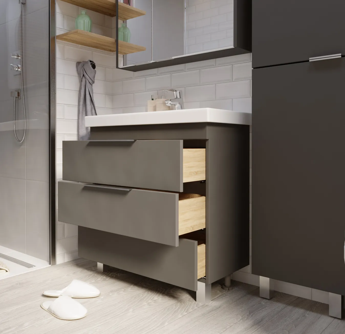 Тумба для современной или эклектичной ванной комнаты с тремя вместительными выдвигающимися ящиками, дополненными оригинальными ручками. Она создана специально для поклонников актуальных решений в дизайне мебели для ванной комнаты, поэтому отличается лаконичным дизайном, отсутствием лишних деталей и бескомпромиссной функциональностью. Ее дополнительное преимущество состоит в благородном сером цвете корпуса. Разделение ящиков на функциональные отсеки делает ежедневное использование тумбы еще более удобным и комфортным.